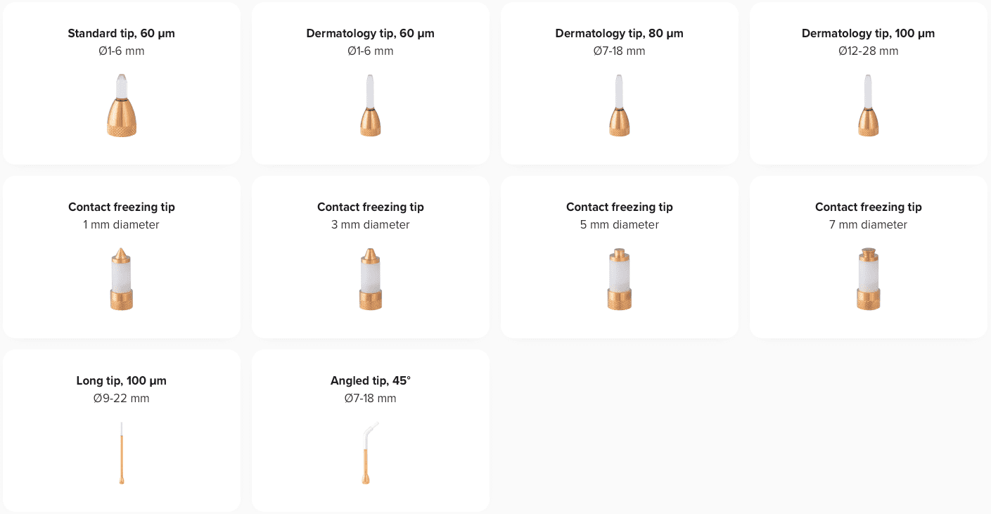 Með fjölbreyttum oddum getur fótaaðgerðafræðingur lagað CryoIQ nákvæmlega að stærð, staðsetningu og eðli húðbreytingarinnar og tryggt þannig hámarksárangur og örugga meðferð.